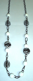 Colar com várias peças pretas e brancas, bolas brancas de madeira.